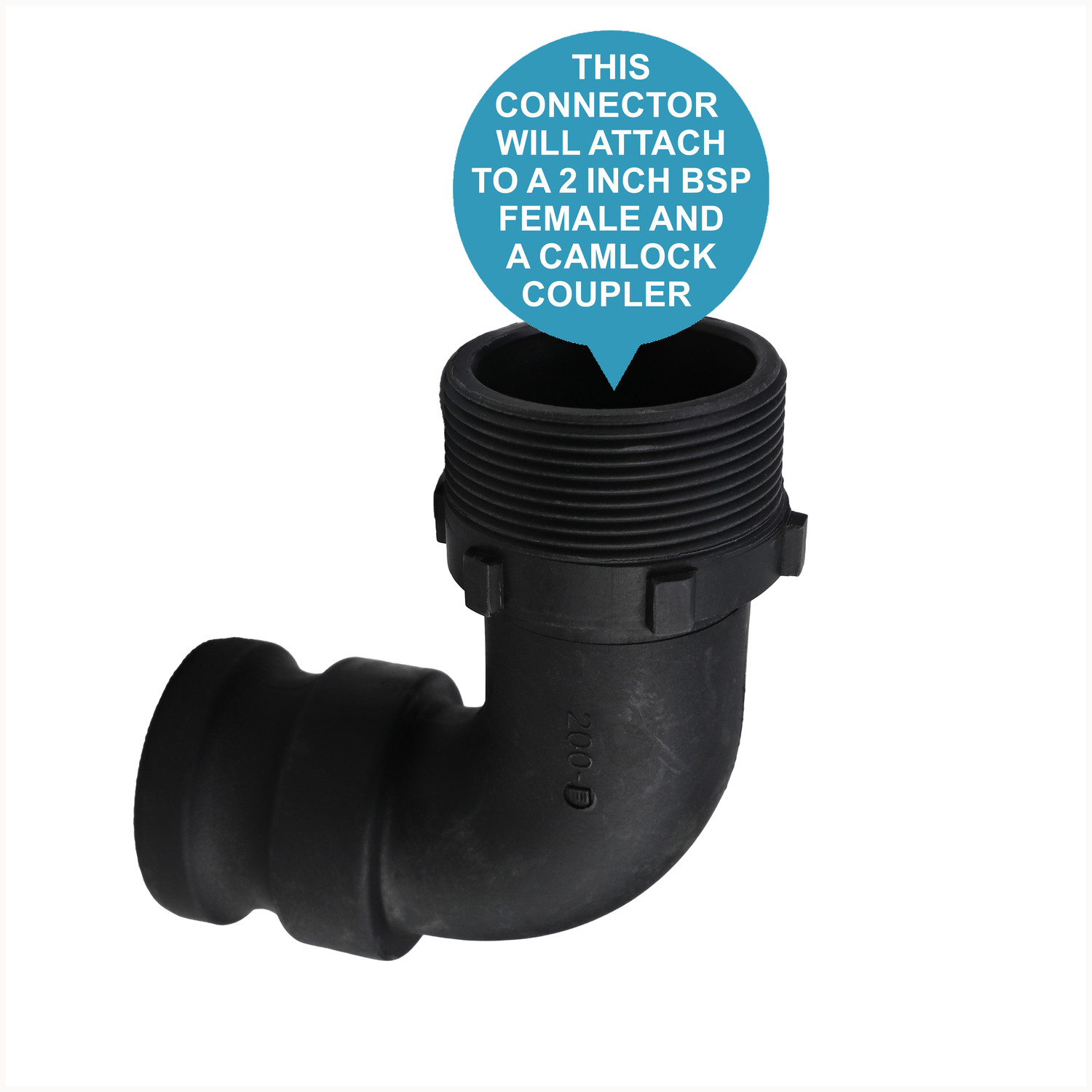 This adapter will give you a 90-deree angle to your connection. This connector will connect to an 2inch BSP Female & a Camlock Coupler.