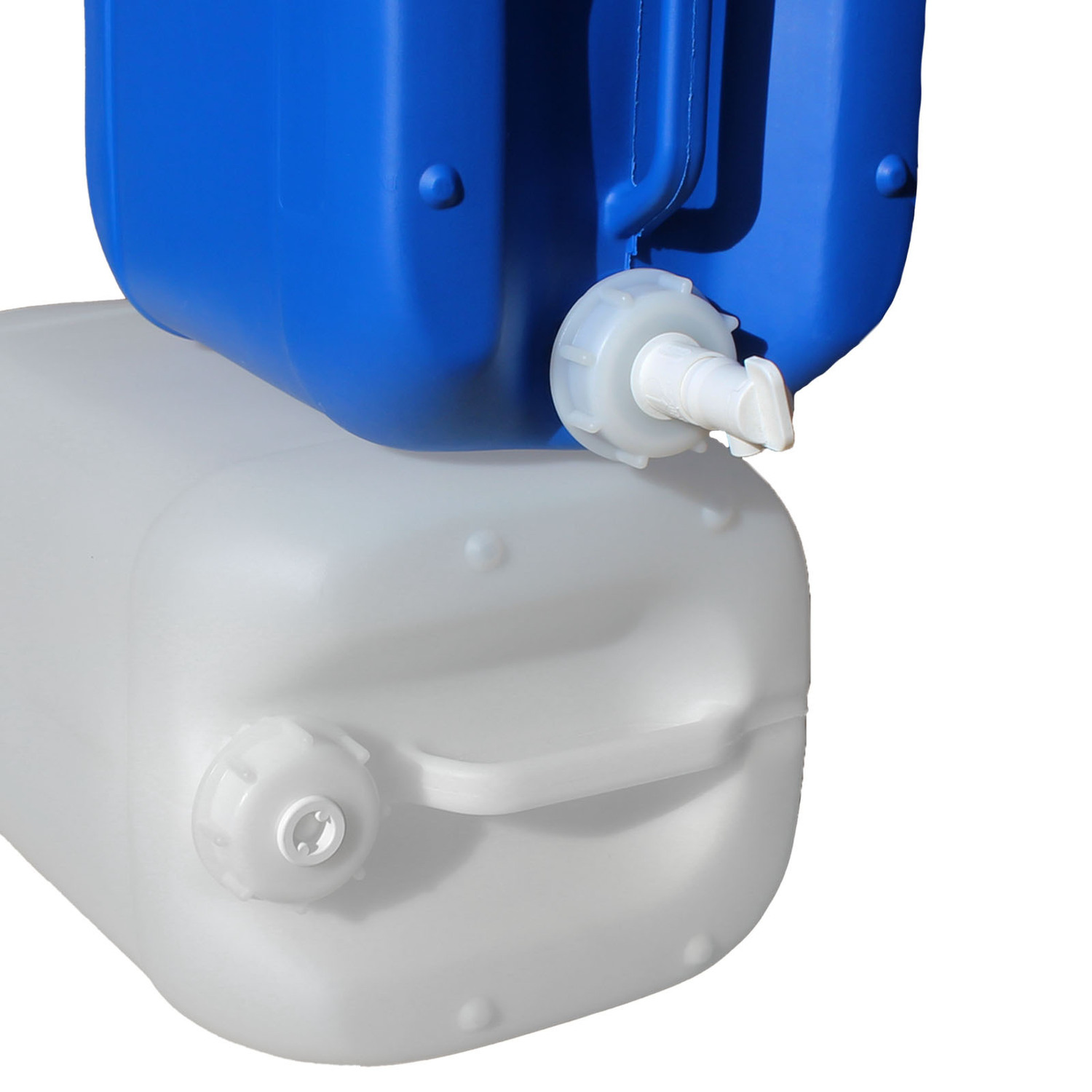 These adapters will fit most standard UK and European IBCs & Jerry Cans where the outer thread after the valve is a Din61 S60x6 male thread. The jerry cans remain stackable with screwed closure. If necessary, the drain tap is screwed from the inside to the outside.