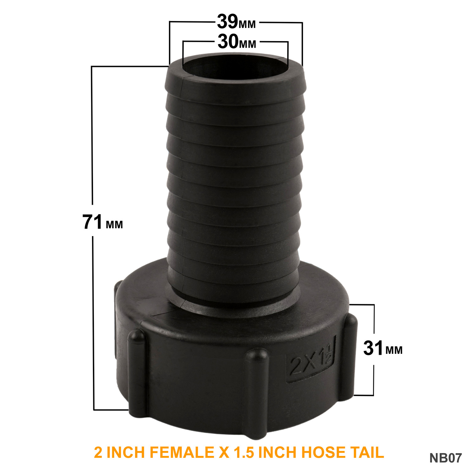 A top tip for choosing the correct size hose barb is to not measure the outer diameter (OD) of your hose, instead always measure the inner diameter (ID). So, for example if your hose has an internal diameter of 50mm (2inch), you need a 50mm (2inch) hose tail.