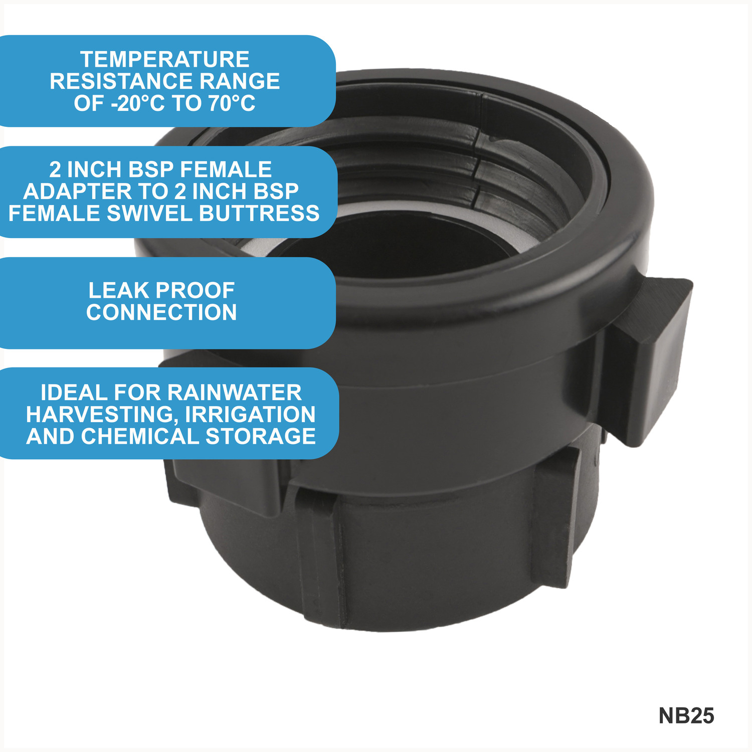 Upgrade your IBC container's functionality and versatility with the NB25 IBC S60x6 (2 inch) Female to (2 inch) BSP Female Swivel Buttress adapter.